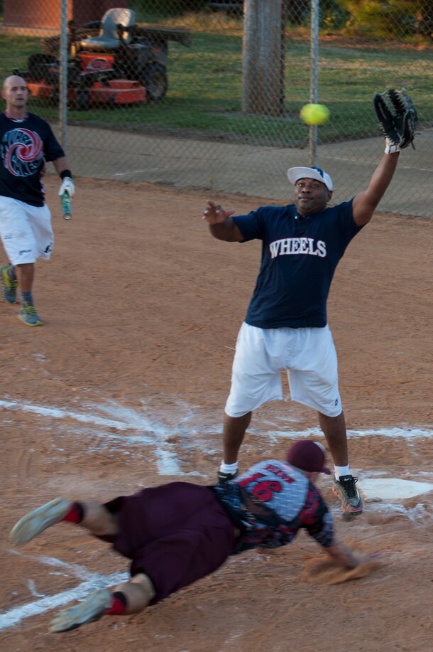 Deametrious Bagwell, Fort Eustis All-Stars catcher, jumps for the ball while Garrett Dixon, Langley All-Stars outfielder, dives for home plate during the Joint Base Langley-Eustis All-Stars Softball game at Langley Air Force Base, Va., Oct. 14, 2015. The All-Stars game was held as part of the on-going Commander’s cup competition and gathered the best players from the 2015 JBLE intermural softball season. (U.S. Air Force photo by Senior Airman R. Alex Durbin/Released)