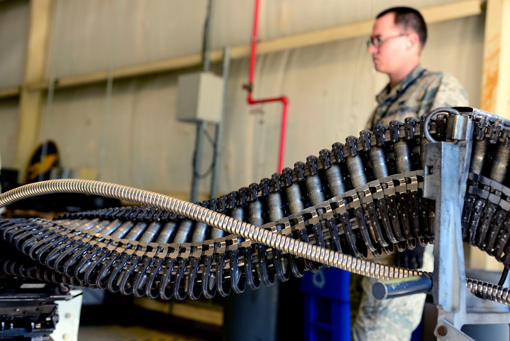 U.S Air Force Airman 1st Class Deacon Tait, 1st Maintenance Squadron conventional maintenance technician, waits as 20 millimeter rounds are uploaded to be transported to the flight line at Langley Air Force Base, Va., Oct. 19, 2015. More than 450 rounds were downloaded, inspected and uploaded into a Universal Ammunition Loader in support of armament training. (U.S. Air Force photo by Airman 1st Class Derek Seifert/ Released)