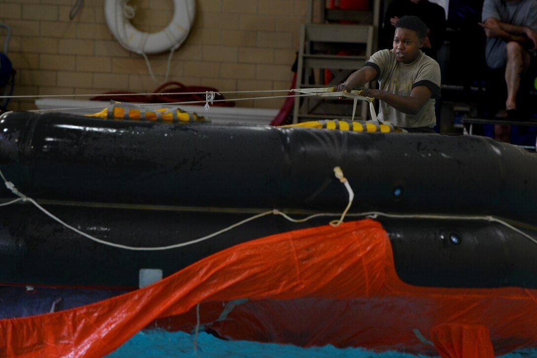 U.S. Army Pvt. Ruby Mead, a watercraft operator student with the Maritime Intermodal Training Department, pulls a 25-person life raft at Fort Eustis, Va., Jan. 26, 2016. The life raft was flipped over to simulate a scenario out at sea in which Soldiers single-handedly turn it right side up. (U.S. Air Force photo by Staff Sgt. Natasha Stannard)