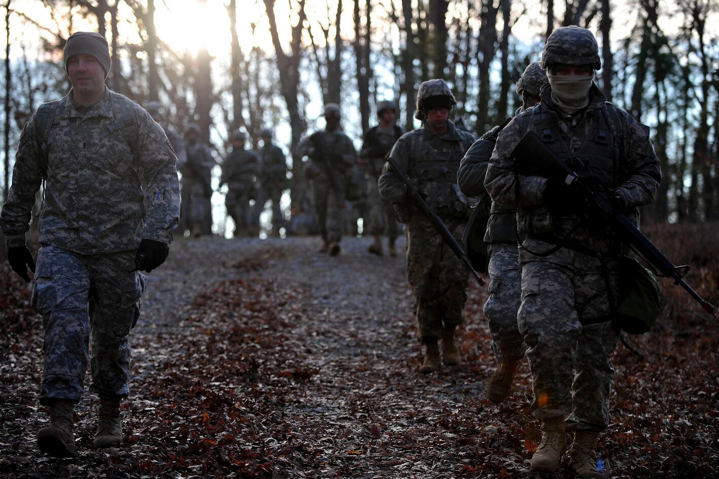 U.S. Soldiers assigned to the 73rd Transportation Floating Craft Company of the 19th Transportation Battalion, 7th Transportation Brigade (Expeditionary) walk to a rally point during a field training exercise at Fort A.P. Hill, Va., Jan. 12, 2016. The exercise featured four simultaneous lanes, which tested warrior tasks and battle drills of each squad, each of which consisted of 10 to 15 personnel. (U.S. Air Force photo by Senior Airman Breonna Veal)