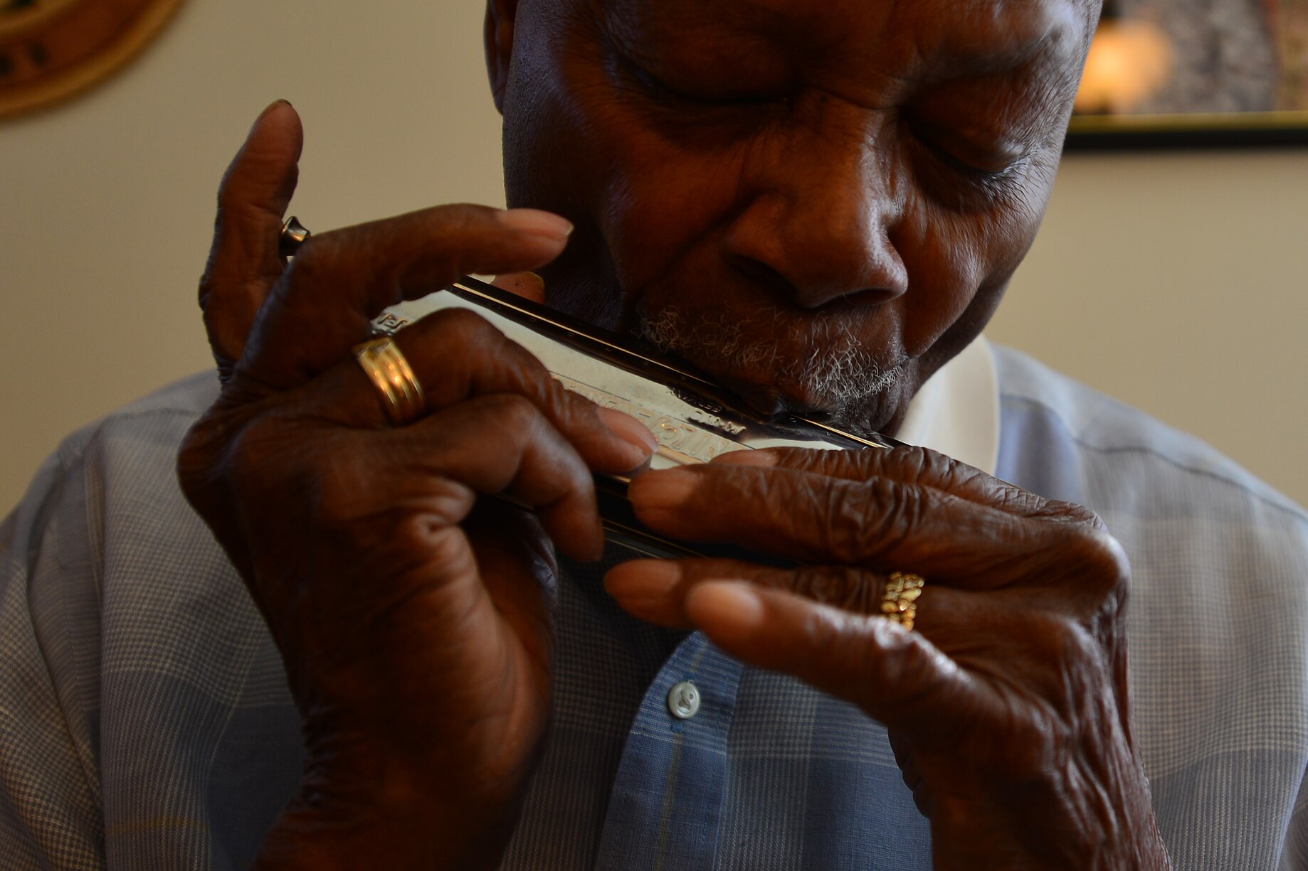Retired U.S. Army Col. Aaron M. Dotson, a World War II and Vietnam War veteran, plays the harmonica in his room in Hampton, Va., Aug. 8, 2015. Dotson studied music at Fisk University in Nashville, Tenn., before changing his major to sociology with a minor in psychology. (U.S. Air Force photo by Staff Sgt. Natasha Stannard)