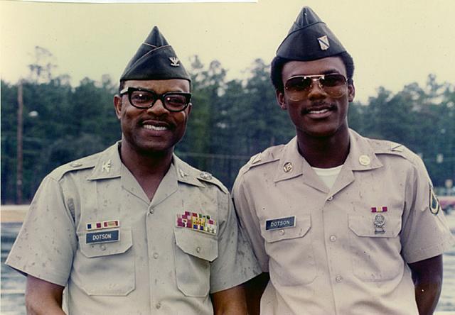 U.S. Army Col. Aaron M. Dotson, a retired World War II and Vietnam War veteran, poses for a photo with his son Pfc. Adrian Dotson. While both are now retired, the Dotson’s still actively participate in military functions at Fort Eustis, Va. (Courtesy photo)