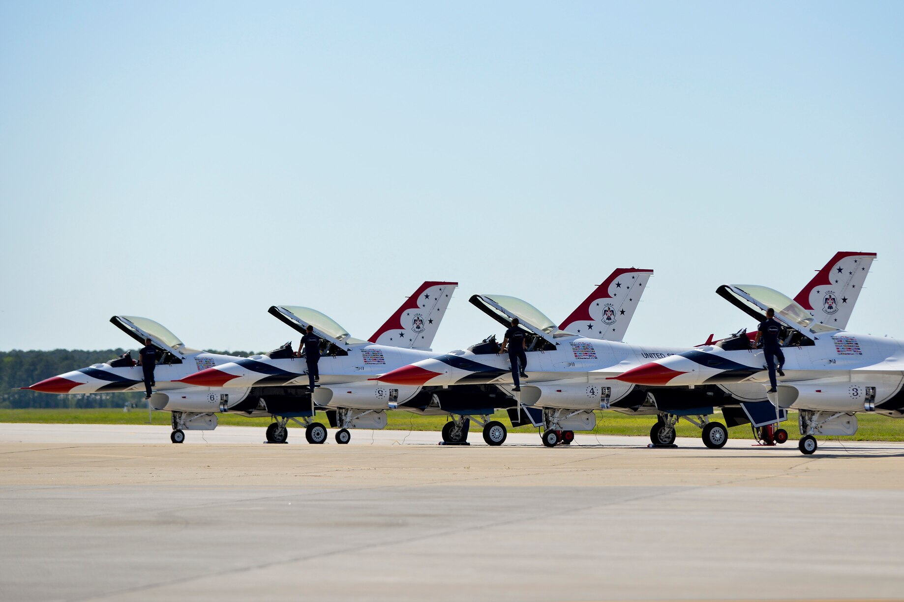U.S. Air Force Thunderbirds aerial demonstration team crew chiefs check in with pilots before their flight during the AirPower over Hampton Roads Open House at Langley Air Force Base, Va., April 24, 2016. The Thunderbirds fly the F-16 Fighting Falcon, the Air Force’s first multi-role fighter aircraft. (U.S. Air Force photo by Staff Sgt. Natasha Stannard)