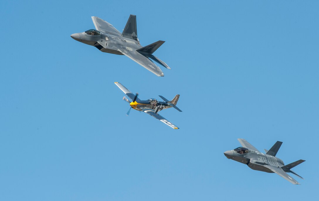 An F-22 Raptor, F-35 Lighting and P-51 Mustang fly in formation as part of the U.S. Air Force Heritage Flight during the AirPower over Hampton Roads Open House at Langley Air Force Base, Va., April 24, 2016. The Heritage Flight presents the evolution of Air Force air power by flying today’s state-of-the-art aircraft in formation with vintage fighter aircraft. (U.S. Air Force photo by Senior Airman Kayla Newman)