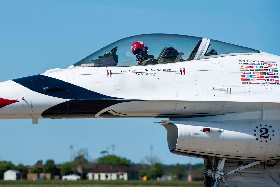 U.S. Air Force Capt. Ryan Bodenheimer, a pilot for the U.S. Air Force Thunderbirds aerial demonstration team, maneuvers his F-16 Fighting Falcon on the flight line at Langley Air Force Base, Va., April 24, 2016. The Thunderbirds Show Line consists of 24 professionals in various aircraft maintenance specialties and they are selected before each demonstration season based on their job proficiency, dedication to duty, and overall attitude. (U.S. Air Force photo by Airman 1st Class Derek Seifert)