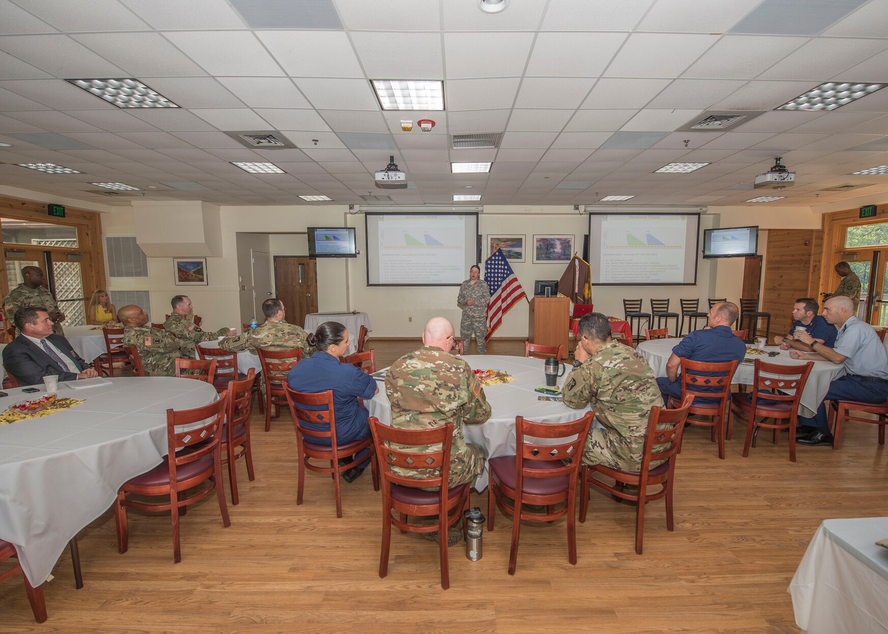 U.S. Army Chief Warrant Officer 3 Reba Wallner, Human Resources Center junior signal warrant assigned officer, speaks during Warrant Officer Week at Fort Eustis, Va., July 7, 2016. Warrant Officer Week gives warrant officers of all branches a way to network, voice their concerns and learn updated information regarding the warrant officer ranks. (U.S. Air Force photo by Airman 1st Class Derek Seifert)