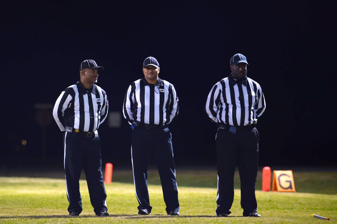 Referees talk before the Intramural Football Championship game at Joint Base Langley-Eustis, Va., Nov. 10, 2016. The referees ensured a safe and fair game between the two competing teams. (U.S. Air Force photo by Senior Airman Kimberly Nagle)