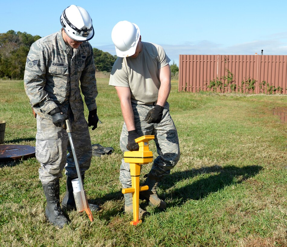 U.S. Air Force Senior Airman Bruce Winsemius, 633rd Communication Squadron cable and antenna technician, and Airman 1st Class Austin Zudak, 633rd Communication Squadron cable and antenna apprentice, mark the cable lines with spray paint at Langley Air Force Base, Va., Nov. 15, 2016. Using the electronic detection device, the cable and antenna team can map out the lines of cable throughout base. (U.S. Air Force photo by Kaylee Dubois)