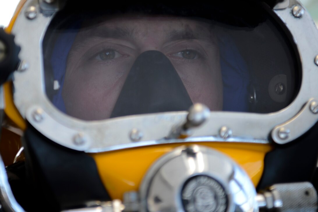 U.S. Army Spc. Michael Brown, 30th Engineer Battalion, 20th Eng. Brigade, 74th Engineer Eng. Dive Detachment salvage diver, secures his surface supply helmet during dive-tank training at Joint Base Langley-Eustis, Va., June 6, 2017. The surface supply helmet allows for divers to submerge with continuous oxygen and communication. (U.S. Air Force photo/Airman 1st Class Kaylee Dubois)