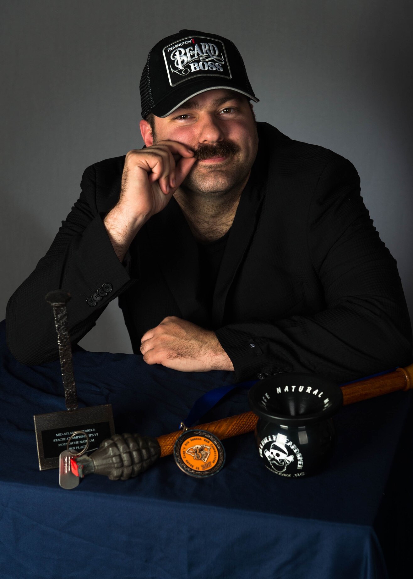 U.S. Air Force Staff Sgt. Oscar Bruck, 1st Aircraft Maintenance Squadron dedicated crew chief, poses for a portrait at Joint Base Langley-Eustis, Va., Nov. 30, 2017. As part of the Hampton Roads Beard and Stache Society, Bruck has won various trophies, but the most important thing to him are the charities the competitions raise money for. (U.S. Air Force photo by Airman 1st Class Anthony Nin Leclerec)