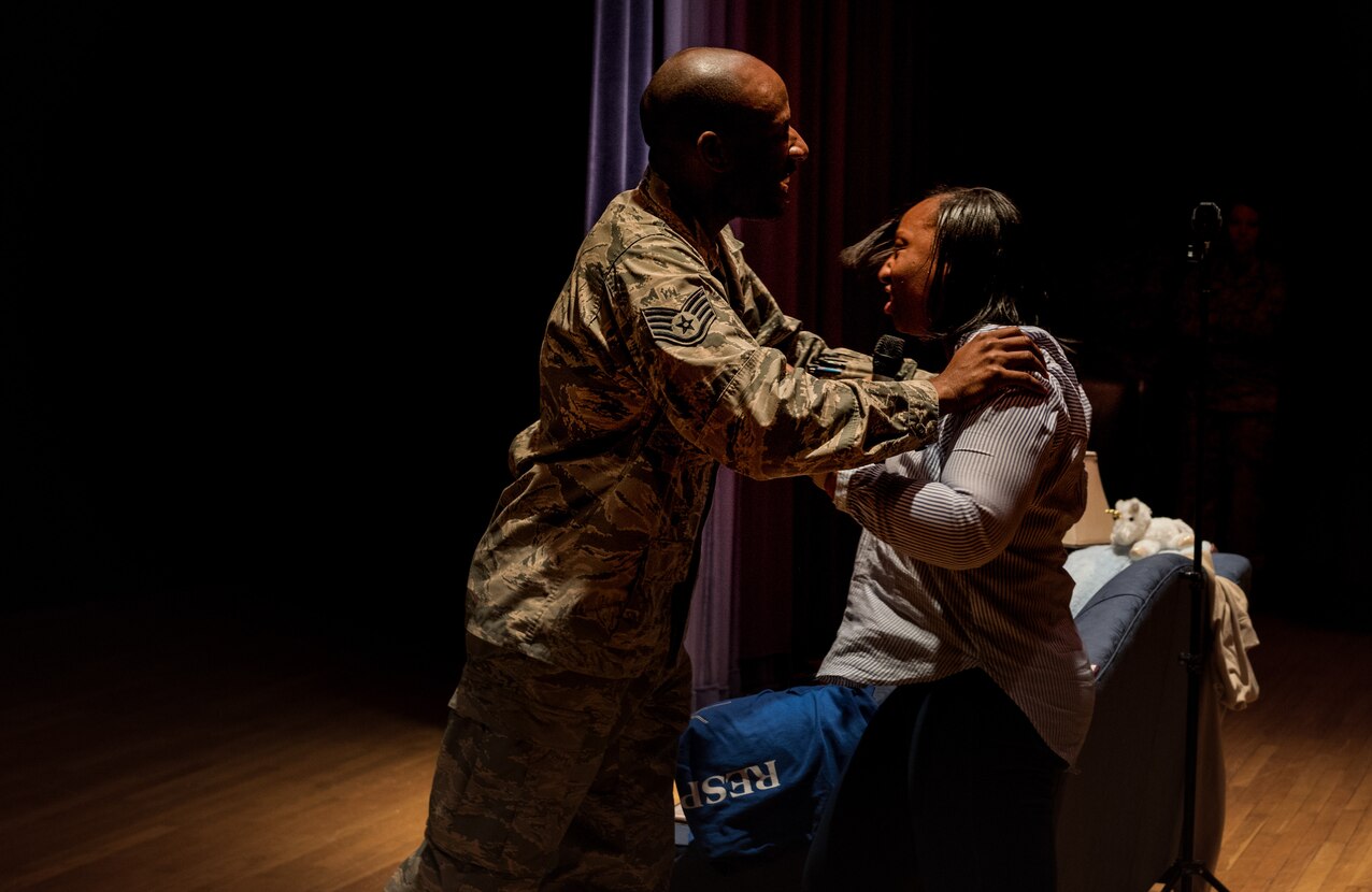 U.S. Air Force Staff Sgt. Patrick Sims, 733rd Logistics Readiness Squadron, portraying the role of SSgt Brown [the supervisor] assaults, Master Sgt. Biagi Borrero, Air Combat Command occupational safety manager, portraying Airman First Class Houston [the victim] during the Sexual Assault Theater Group performance “Same Script, Different Cast” at Joint Base Langley-Eustis, Va., April 13, 2018. The play gives a new take on sexual assault awareness, highlighting the theme for Sexual Assault Awareness month “Protecting our people, protects our mission. U.S. Air Force photo by Staff Sgt. Carlin Leslie)