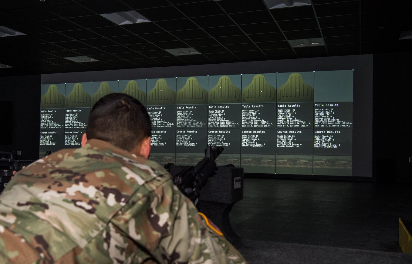 A U.S. Army Soldier from the Foxtrot Company, 1st Battalion, 210th Aviation Regiment, 128th Avn. Brigade trains at the Engagement Skills Trainer at Joint Base Langley-Eustis, Virginia, March 20, 2019. The EST can be calibrated to suit many different firearms, meaning if a unit at Fort Eustis has a weapon, EST will have a simulation for that weapon. (U.S. Air Force photo by Senior Airman Tristan Biese)