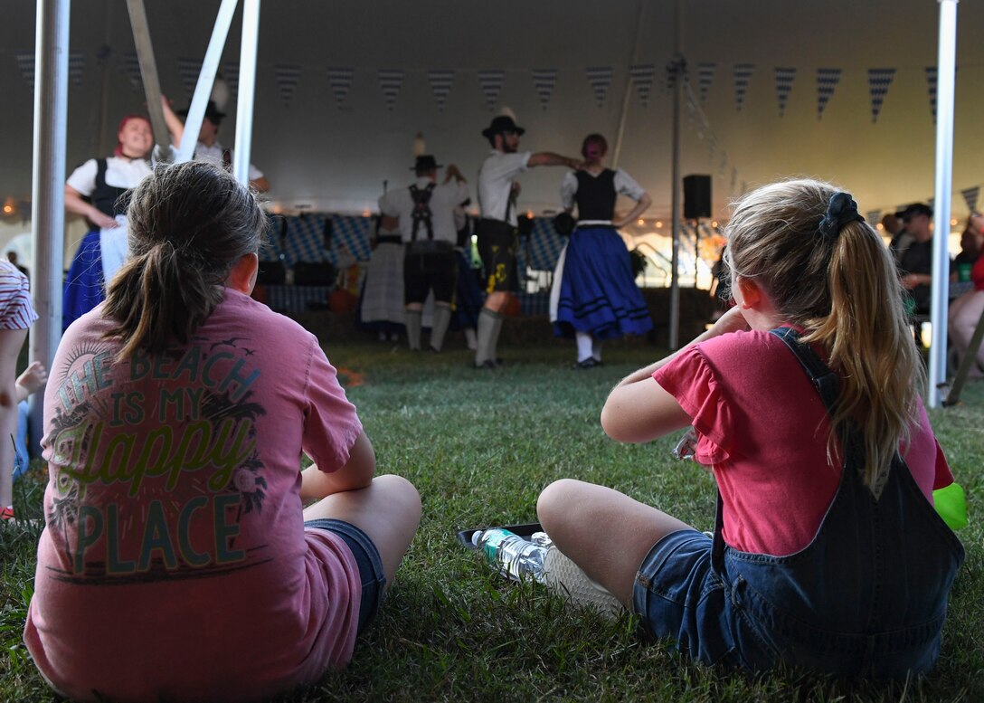 Children watch members of the Original Elbe-Musikanten German Band perform during an Oktoberfest celebration at Joint Base Langley-Eustis, Virginia, Sept. 27, 2019. The 633rd Force Support Squadron hosted this band which specializes in traditional wind music from the Czech and German Elbe river regions. (U.S. Air Force photo by Senior Airman Monica Roybal)