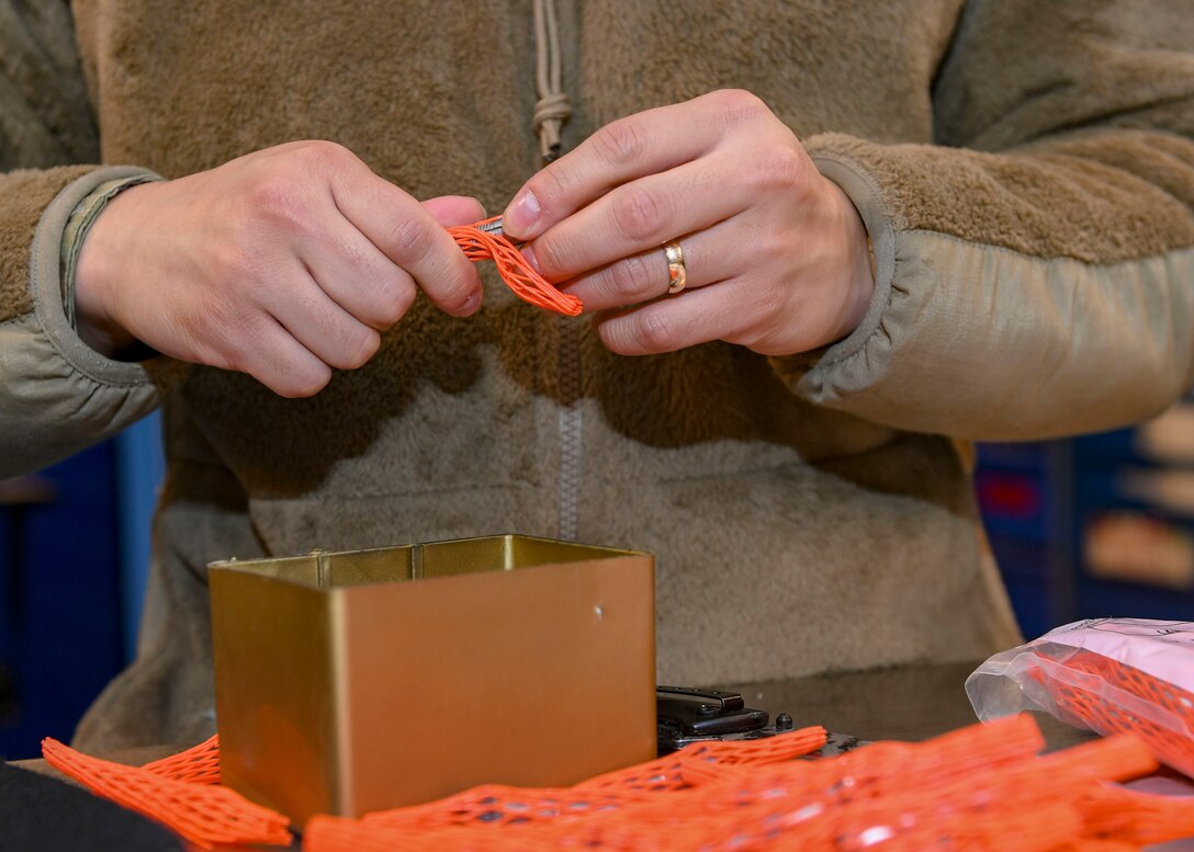 U.S. Air Force Senior Airman Andy Vo, decentralized materiel support technician, puts inventory into boxes at Joint Base Langley-Eustis, Virginia, Dec. 13, 2019. During downrange operations, F-22s still require upkeep and maintenance, and DMS provides support to get the necessary parts. (U.S. Air Force photo by Senior Airman Alexandra Singer)