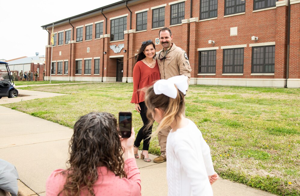 A U.S. Airman who has recently returned home from a deployment to the United Arab Emirates, poses for a photo with family members at Joint Base Langley-Eustis, Virginia, April 7, 2022. Airmen from the 633d Air Base Wing, 1st Fighter Wing and 192d Wing worked in conjunction to short-notice deploy U.S. Air Force F-22 Raptors from the 27th Fighter Squadron to the U.S. Central Command area of responsibility. (U.S. Air Force photo by Tech. Sgt. Ceaira Tinsley)