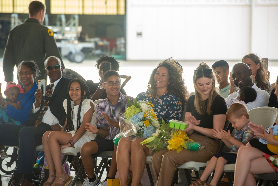 Family members and friends of U.S. Air Force Lt. Col. Calvin Peterson, Jr., incoming 27th Fighter Squadron commander, performs the invocation during a change of command ceremony, at Joint Base Langley-Eustis, Virginia, June 16, 2022. As commander, Peterson will be responsible for approximately 300 Airmen who provide combat ready, rapidly deployable F-22 Raptor air superiority to Combatant Commanders. (U.S. Air Force photo by Tech. Sgt. Ceaira Tinsley)