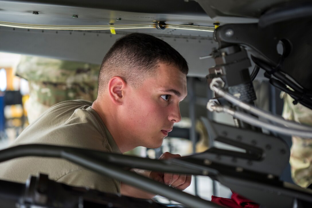 U.S. Army Pfc. Brady Peckinpaugh, a student at the 128th Aviation Brigade, practices routine maintenance on a gun turret of a Boeing AH-64 Apache attack helicopter during a hands-on training lesson at Joint Base Langley-Eustis, Virginia, July 22, 2022. The 24 week-long school provides initial training in the 15Y Military Occupational Specialty, providing armament, electrical and avionics systems repairs for twin-engine attack helicopters. (U.S. Air Force Photo by Abraham Essenmacher)