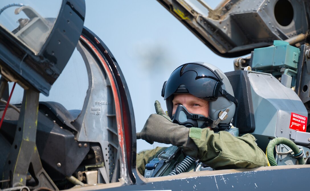 U.S. Air Force Senior Airman Kostiantyn Khymchenko, 633d Civil Engineer Squadron job heating, ventilation, air conditioning journeyman, salutes with “the Shaka” while sitting in the back of a T-38 Talon at Joint Base Langley-Eustis, Virginia, June 29, 2023. Khymchenko received an incentive flight in a T-38 Talon; a reward for his notable performance as an Airman and leader. (U.S. Air Force photo by Airman 1st Class Mikaela Smith)