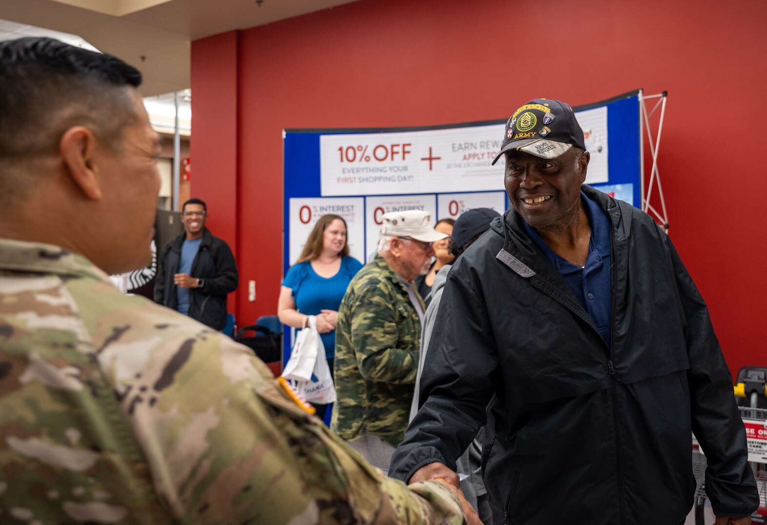 U.S. Army Col. Frankie Cochiaosue, 733d Mission Support Group commander presents an Army veteran a limited-edition Veteran’s Day coin in recognition of their service to the country.at Joint Base Langley-Eustis, Virginia, Nov. 10, 2023. President Dwight D. Eisenhower signed the bill proclaiming Armistice Day to Veteran’s Day in 1954, to honor all those who have served in the United States Military. (U.S. Air Force photo by Airman 1st Class Olivia Bithell)