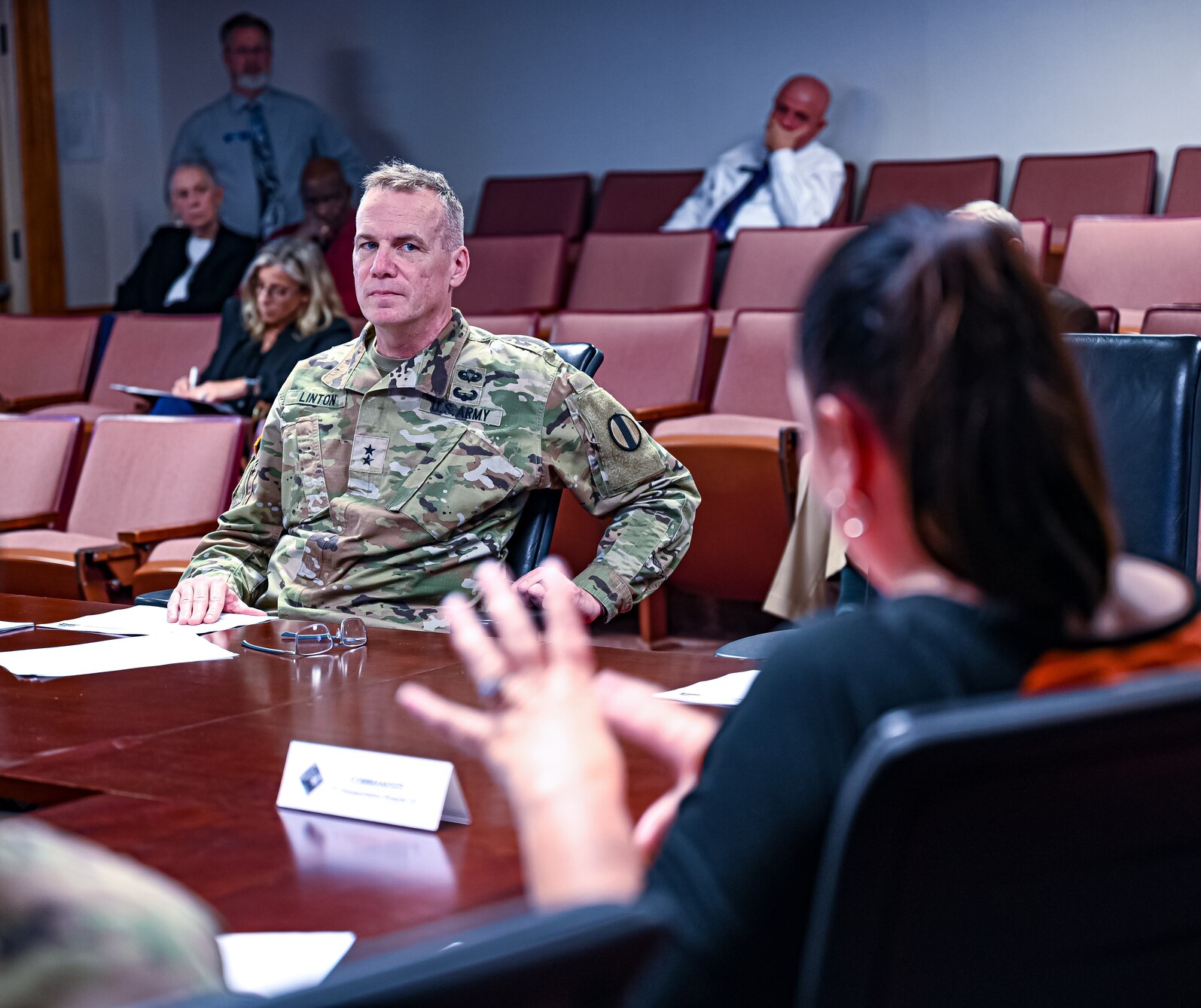 U.S. Army Maj. Gen. Laurence “Scott” Linton, Army Training and Doctrine Command Deputy Chief of Staff, listens as an Army Family Action Plan committee member explains the moving benefits available to retirees’ spouse during the AFAP meeting at Joint Base Langley-Eustis, Virginia, Oct. 25, 2024. During their final move, the committee determined that in addition to their current benefits, spouses will also be eligible for a one-time DoD job priority status. (U.S. Air Force photo by Senior Airman Olivia Bithell)