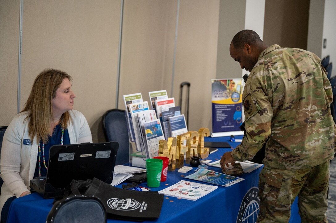 U.S. Air Force Tech. Sgt. Steven Baptiste, 83d Network Operations Squadron Noncommissioned Officer in Charge operations scheduler, obtains information provided by Susan Wilinski, Military & Financial Readiness Center community readiness consultant, during the Finance Readiness Summit at Joint Base Langley-Eustis, Virginia, Feb. 25, 2025. The Military & Family Readiness Center hosted the Finance Readiness Summit and provided briefs about budgeting, credit/debt, legal counsel, Thrift Savings Plan, and other resources for Airmen to achieve financial readiness. (U.S. Air Force photo by Airman 1st Class Donnell Ramsey)
