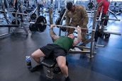 U.S. Air Force Staff Sgt. Raquan Middlebrooks, 633d Force Support Squadron fitness and sports supervisor, spots the bench lifting of Staff Sgt. Jacob Bernard, 700th Air Support Squadron command and control current operations technician, during the Warrior Bench Press Competition at Joint Base Langley-Eustis, Virginia. Mar. 12, 2025. At either the Shellbank or Air Combat Command gyms, the 633d FSS invited participants to get their repetitions recorded from 6am to 8pm. (U.S. Air Force Photo by Airman 1st Class Donnell Ramsey)