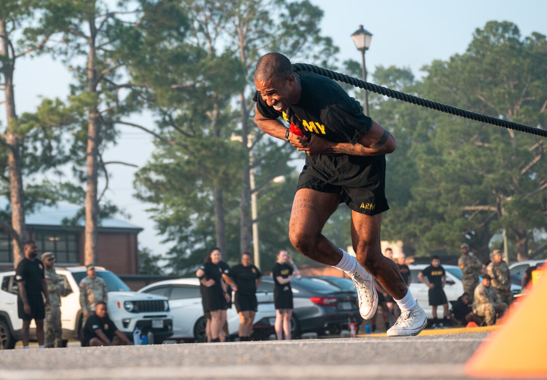 A U.S. Army Soldier participates in a Humvee pull-push competition at Joint Base Langley-Eustis, Virginia, June 12, 2025. The competition highlighted the soldiers’ strength and teamwork, honoring the Army’s upcoming 250th birthday, June 14, 2025. (U.S. Air Force photo by Senior Airman Mikaela Smith)
