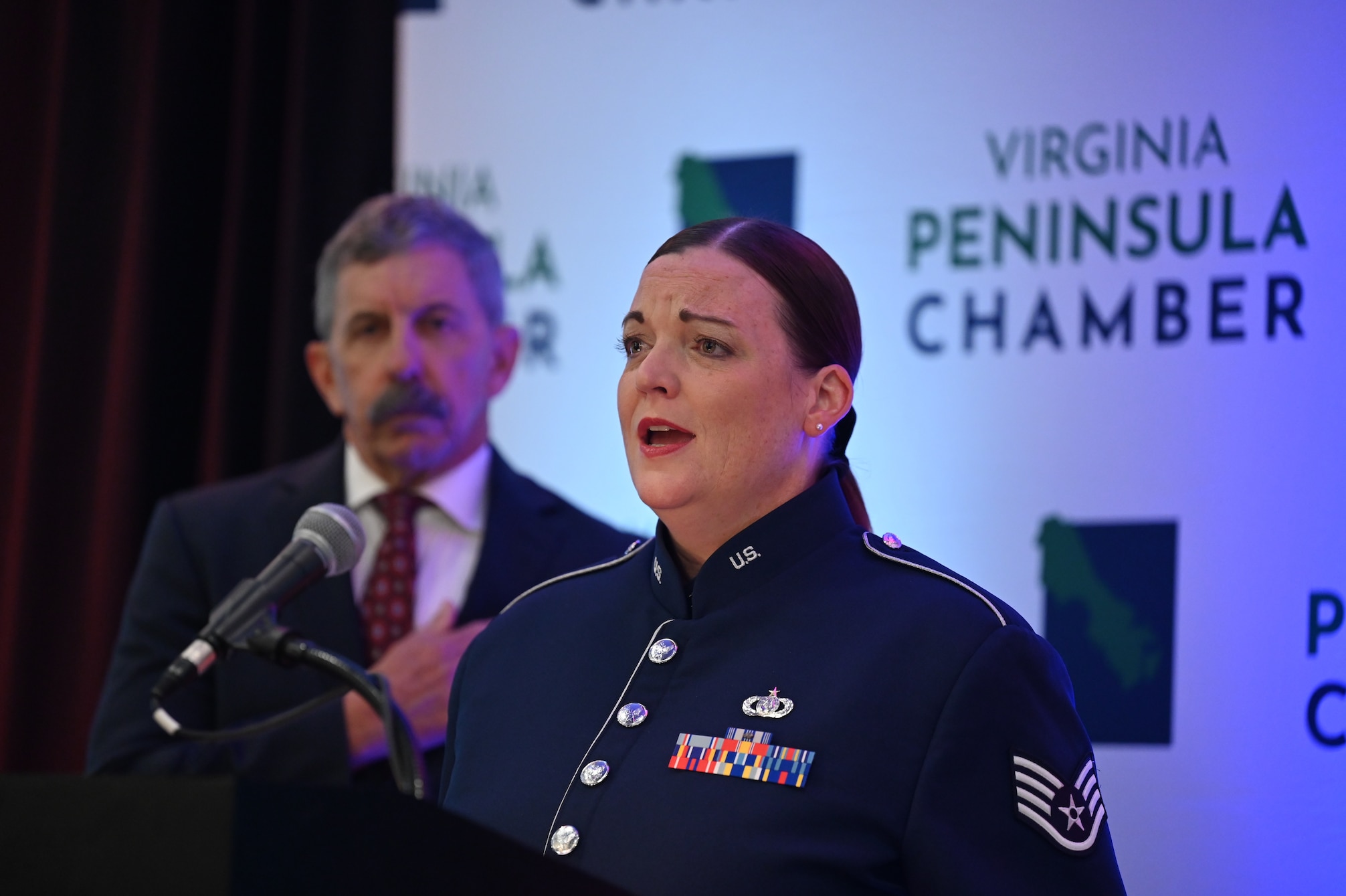 U.S. Air Force Staff Sgt. Julie Mishler, U.S. Air Force Heritage of America Band vocalist, performs the national anthem during the Virginia Peninsula Chamber’s Military Recognition Ceremony Sept. 10, 2025, in Newport News, Virginia. The chamber hosts the annual event to honor outstanding performers from the U.S. Army, Air Force Marine Corps, Navy, and Coast Guard, which are all services represented within the local community (U.S. Air Force photo by Master Sgt. Ceaira Tinsley)