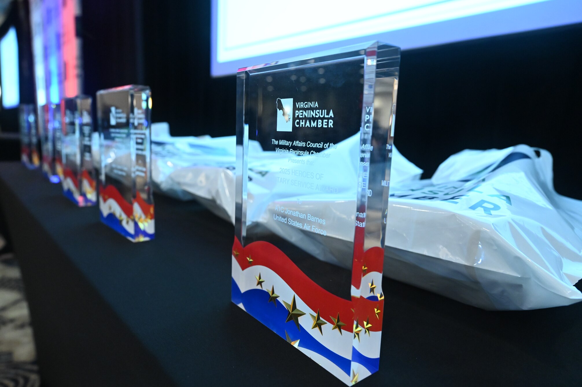Trophies rest on a table during the Virginia Peninsula Chamber’s Military Recognition Ceremony Sept. 10, 2025, in Newport News, Virginia. The chamber recognized six service members from installations in the local area as its “Service Members of the Year.” (U.S. Air Force photo by Master Sgt. Ceaira Tinsley)