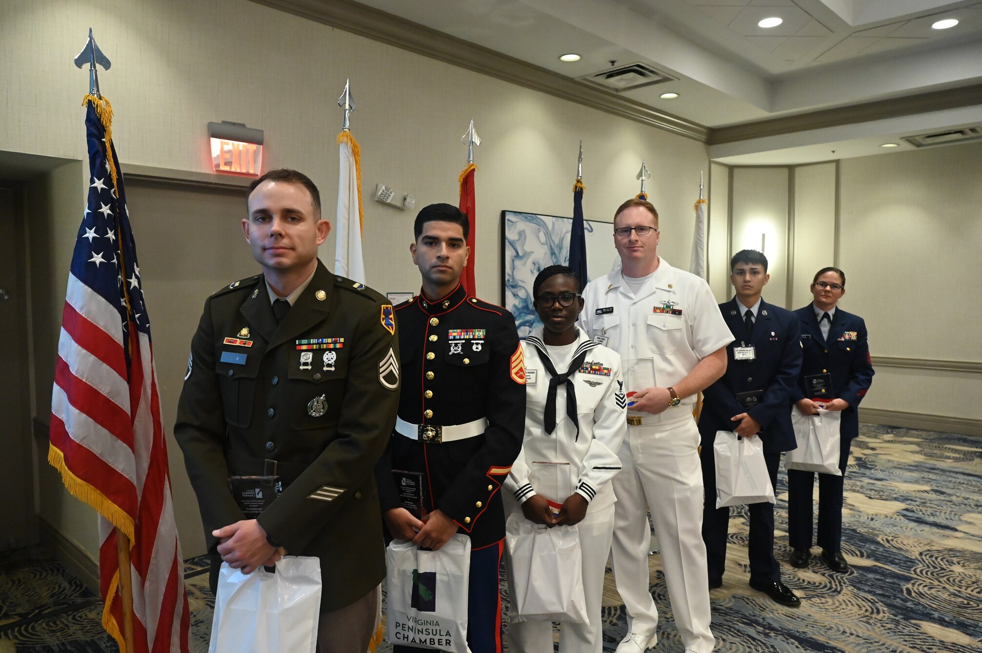 Service Members pose for a photo during the Virginia Peninsula Chamber’s Military Recognition Ceremony Sept. 10, 2025, in Newport News, Virginia. The chamber hosts the annual event to honor outstanding performers from the U.S. Army, Air Force Marine Corps, Navy, and Coast Guard, which are all services represented within the local community. (U.S. Air Force photo by Master Sgt. Ceaira Tinsley)