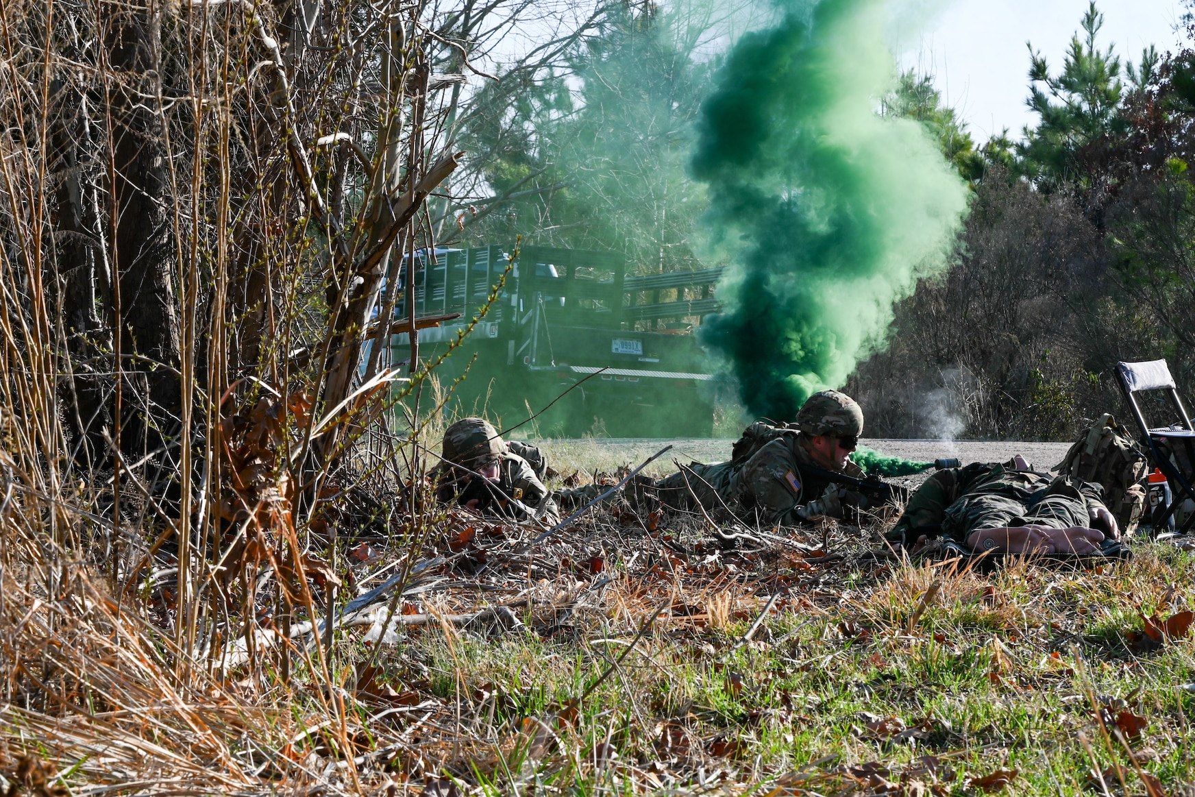 U.S. Army Soldiers from the 128th Aviation Brigade engage in simulated combat fire during Phoenix Week at Joint Base Langley-Eustis, Virginia, March 5, 2026. Phoenix Week is a capstone field training event that blends classroom instruction with hands-on field application, reinforcing core soldier fundamentals, resilience and readiness for large scale combat operations. (U.S. Air Force photo by Airman 1st Class Donnell Ramsey)