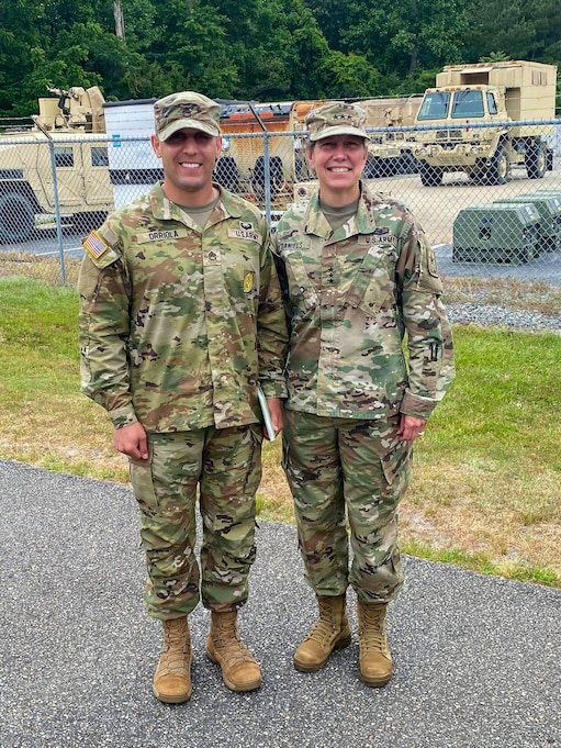 U.S. Army Staff Sgt. Manuel Orriola, 91st Transportation Detachment noncommissioned officer in charge of operations, smiles alongside Lt. Gen. Jody Daniels, Chief of Army Reserve and Commanding General of the U.S. Army Reserve Command, during her visit at Joint Base Langley-Eustis, Virginia, May 25, 2021. Recognition from senior leadership highlights the year-round work of Soldiers, inspiring many like Orriola to pursue future goals such as commissioning. (U.S. Air Force courtesy photo)